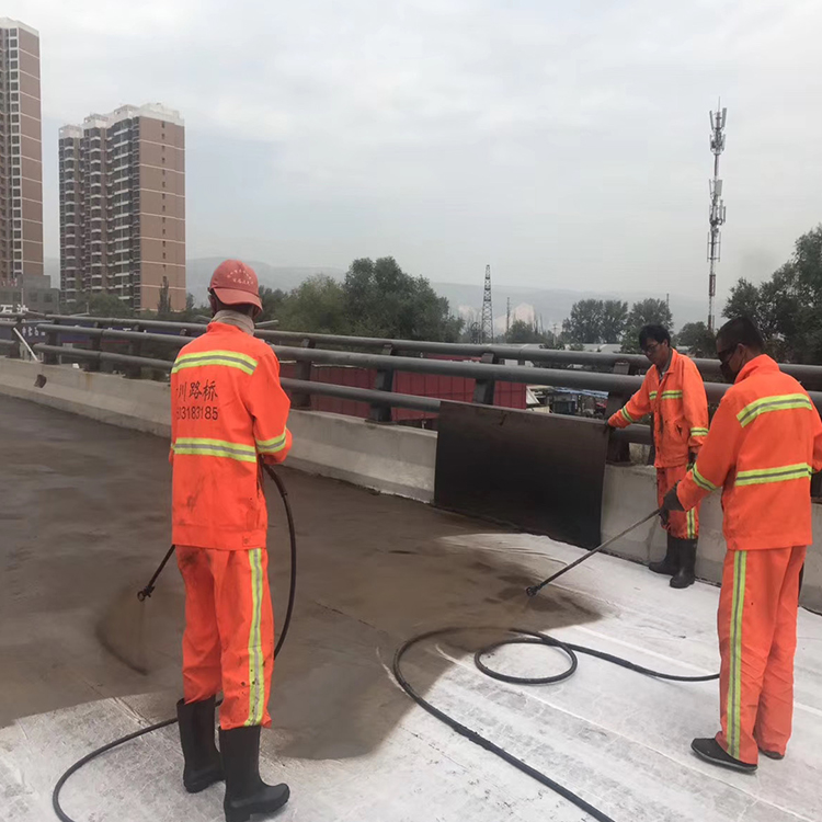 基层处理(抛丸或拉毛)——吹风除尘——基层验收——重点部位处理——1遍防水层——1遍防水层(可根据工程情况进行遍数调节)——防水层养护——摊铺沥青混凝土。