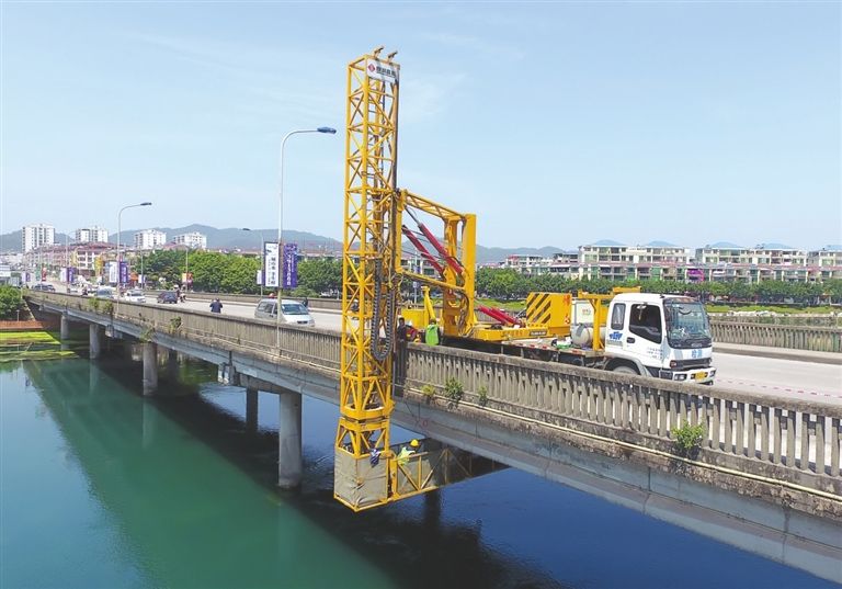 将桥梁检测车开到桥面上,通过伸展出的支架,工作人员爬上工作平台,然后缓缓降到桥面下,对桥梁进行检测。这种检测办法动辄就要占用几股车道,查看速度慢,工人的平安也面临风险。